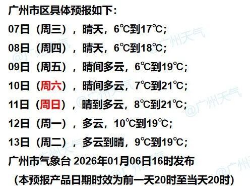 广东省气象台预计,1月7日—8日陆续有弱冷空气补充南下,广东气温略降,湿度减小,有利于昼夜温差加大,整体维持天晴干燥、早晚寒冷的天气。9日,冷空气影响逐渐减弱,白天气温有所回升,但早晚仍较寒冷。