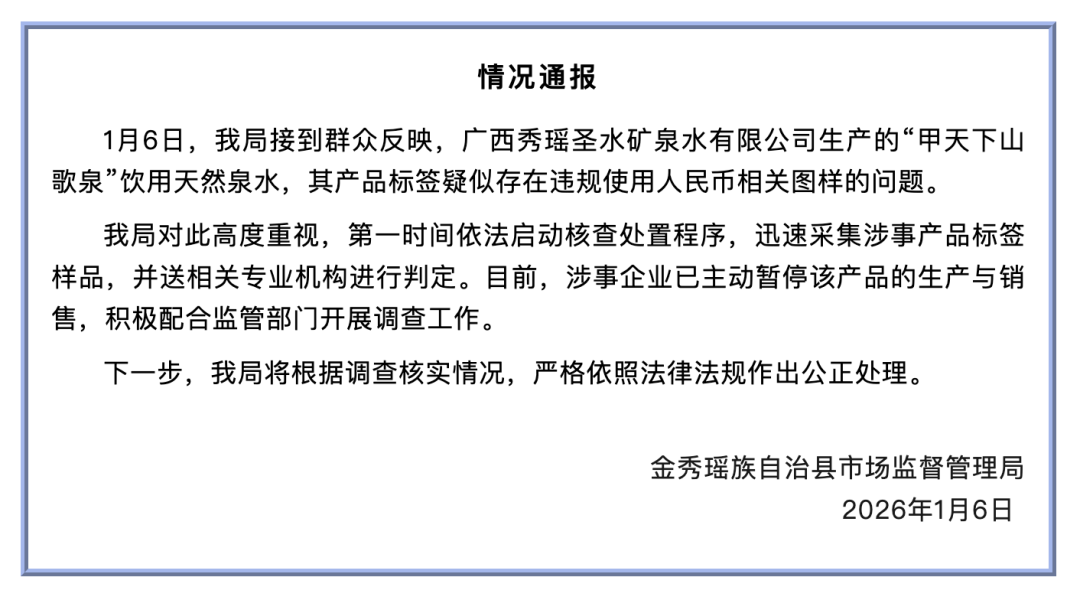 1月6日,该局接到群众反映,广西秀瑶圣水矿泉水有限公司生产的“甲天下山歌泉”饮用天然泉水,其产品标签疑似存在违规使用人民币相关图样的问题。